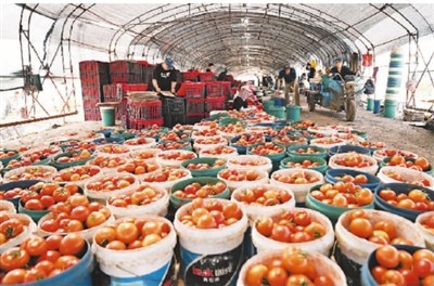 近年来,黑龙江省宁安市将全市500余户贫困户的小额信贷资金集中投放到宁安市庆雨蔬菜专业合作社,建设蔬菜产业园基地,在带动贫困户脱贫增收的同时,壮大合作社蔬菜产业。图为8月11日,在宁安市庆雨蔬菜专业合作社蔬菜产业园基地,工人把刚采摘下来的西红柿打包装箱。