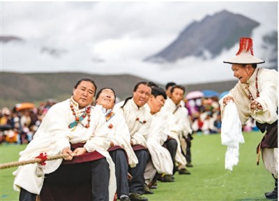一年一度的“当吉仁”赛马节8月8日在平均海拔4300米的西藏拉萨市当雄县开幕,8月10日,作为活动之一的牧民拔河比赛正式举行。图为当雄县牧民在拔河比赛中。