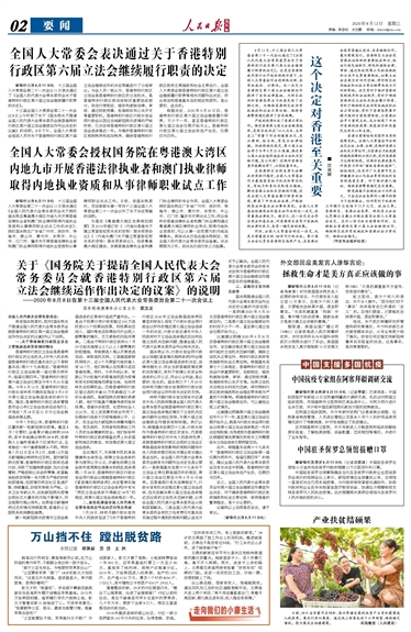 全国人大常委会表决通过关于香港特别行政区第六届立法会继续履行职责的决定