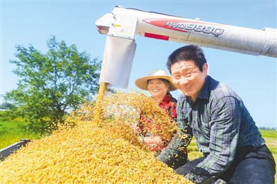 近日,河南省信阳市光山县罗陈乡张楼村迎来头茬再生水稻丰收。图为8月16日,罗陈乡张楼村青龙河合作社社员正在喜收头茬再生水稻。