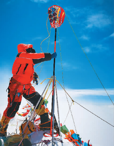 图一:2020珠峰高程测量登山队队员在珠穆朗玛峰峰顶开展测量工作(2020年5月27日摄)。据自然资源部第一大地测量队队长李国鹏介绍,本次测量同时参考四大导航系统,并以北斗的数据为主。 |