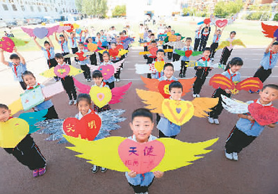 图二:为确保自控力较弱的低年级学生入校后保持安全距离,内蒙古包头市包钢第二十四小学开设了“天使小翅膀 健康一米距”创意防疫课堂活动,用各种一米手工作品让小学生保持间隔一米。图为孩子们展示设计的“一米翅膀”。 |
