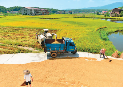 8月24日,在湖南省娄底市双峰县井字镇花山村,农民在收获中稻。初秋时节,湖南省娄底市双峰县的中稻陆续成熟,当地农民抓住晴好天气抢收抢晒。