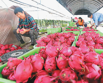 由返乡创业大学生创办的四川省眉山市彭山区硕仙农业观光园,高标准从台湾引种的200亩红心火龙果近来进入采摘季。图为近日村民对采摘的台湾红心火龙果装箱。