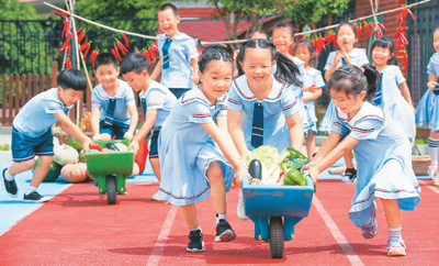 9月1日,浙江省湖州市德清县钟管镇中心幼儿园围绕“节约粮食”主题,组织开学第一课活动。图为孩子们正在进行运输农作物比赛。 |