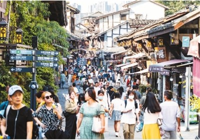 随着“嘉陵江2020年第2号洪峰”过境,重庆市洪水防御一级响应已经取消,磁器口古镇景区也加快完成了古镇景区核心游览区域的清淤和消杀工作。为满足广大游客的游览需求,景区已于8月27日恢复对外接待游客,开放后仍实行网上分时预约制。图为游客在重庆磁器口古镇观光,景区内又恢复了游人如织的景象。