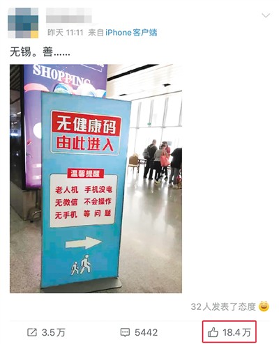 照片很简单,就是个牌子,上写几个大字“无健康码由此进入”,下面还有温馨提醒标明涉及的问题:“老人机、手机没电、无微信、不会操作、无手机等问题”。