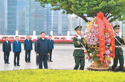 10月14日,深圳经济特区建立40周年庆祝大会在广东省深圳市隆重举行。中共中央总书记、国家主席、中央军委主席习近平在会上发表重要讲话。图为当天下午,习近平来到莲花山公园,向邓小平同志铜像敬献花篮。