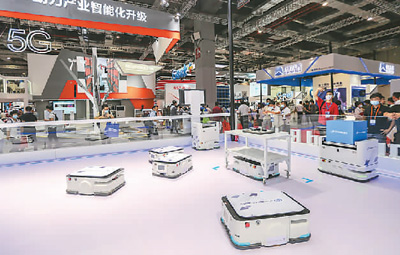 观众在第二十二届中国国际工业博览会观看智能物流机器人作业。 |