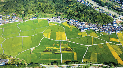 今夏,湖南省怀化市溆浦县北斗溪镇坪溪村三百稻田中的“乡村振兴”和小桥流水图案引人瞩目。 |