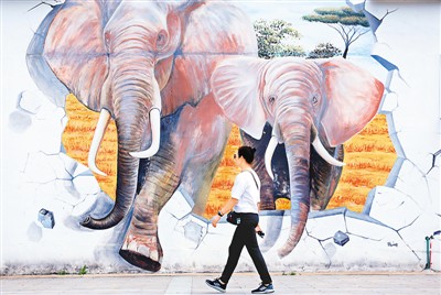 游客行走在安徽省合肥市庐江县汤池镇果树村文化广场艺术画前。 |