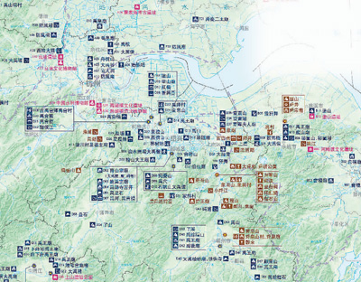 禹迹图为中外大禹文化研究者提供了丰富的资料,记录了印证大禹历史记载、后人大禹文化的相关分布。从钱塘江两岸的局部内容,就可以看出史迹密布程度和大禹文化的发达状况。 |
