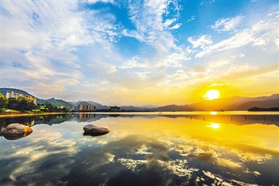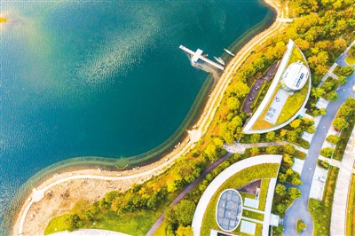 10月24日,浙江淳安县千岛湖珍珠广场的晨曦和秋色吸引游客在此打卡。