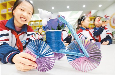 近日,河北省邯郸市邯山区实验小学开展“变废为宝倡勤俭”主题教育活动,同学们利用塑料瓶、废纸箱、光盘等废旧物品制作成各种手工艺品,引导孩子们从小养成勤俭节约的好习惯。