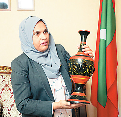 马尔代夫驻华大使艾莎特·阿兹玛在接受采访时展示马尔代夫特色漆器。 |