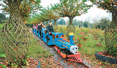 在湖北宜昌一农业休闲点,游客乘小火车体验穿越坡道、草坪、花海等自然模拟场景的乐趣。 |
