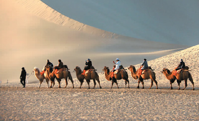 甘肃敦煌推出多项冬春季旅游优惠政策,吸引游客在冬春季节前来旅游。图为游客在鸣沙山月牙泉景区游览。 |