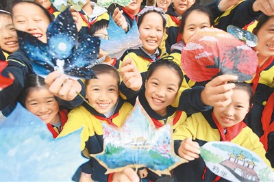 深秋时节,江苏省扬州市梅岭小学西区校的学生们在校园搜集各种落叶,在“创意课堂”上通过白描、彩绘等方式,对树叶进行创意绘画,制作五彩缤纷的树叶画,留住多彩秋天。图为学生在展示树叶画作品。
