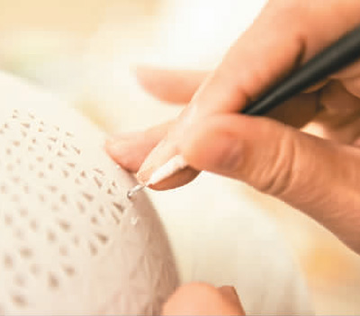 在福建德化明华陶瓷艺术研究所,陶瓷艺术家在制作通花白瓷花瓶。
