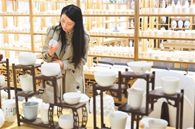 一名网络主播挑选白瓷茶具,准备线上直播销售。