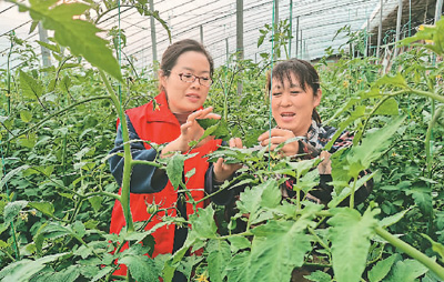 目前,山东省高唐县尹集镇建有包括扶贫大棚在内的蔬菜大棚700多个。为解决种植户遇到的技术难题,尹集镇依靠农技站人员和“土专家”组建起一支农技志愿服务队,深入田间地头为农民提供农技指导。图为在尹集镇王庄村扶贫大棚内,农技志愿者(左)为种植户讲解西红柿管理注意事项。