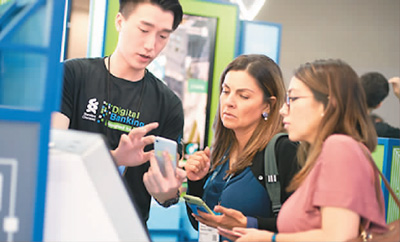 去年香港金融科技周现场,参展商向到访者介绍电子金融产品。 |