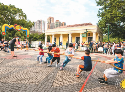 小朋友们在活动现场参与“趣味拔河”游戏。