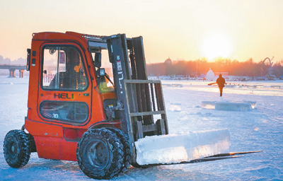 12月7日,当日是大雪节气,第二届哈尔滨采冰节开幕。人们从松花江采冰,将冰块送往哈尔滨市重要景点和大街小巷,装点“冰雪大世界”。图为工人在松花江哈尔滨段江面上采冰。