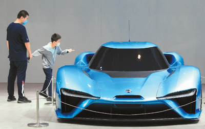 10月3日,江苏省南京市,2020(第十九届)南京国际汽车展览会,人们在蔚来汽车展位前观看展出的一款蔚来纯电动跑车。 |