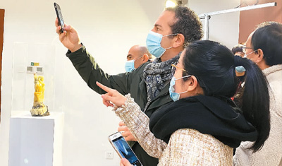 图为贾晓月和马可·卢索和奇罗·埃思博思多在看石雕展览。 |