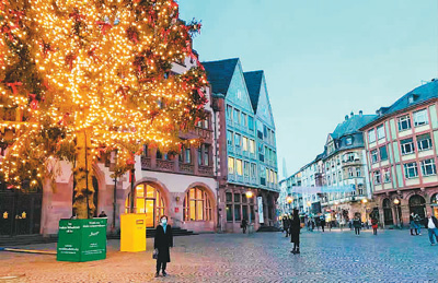 “往年,从12月1日开始,法兰克福的大街小巷就张灯结彩,圣诞市场里都是忙着采购的人群。今年,德国各地的圣诞市场都因新冠肺炎疫情而被取消。法兰克福老城中心的罗马广场上只立着一棵孤零零的圣诞树,几乎看不到什么人。”近日,德国莱茵之父集团董事长房心如给本报记者发来两张照片:一张是往年圣诞节时的罗马广场,灯光璀璨,人流如织;一张是这两天她路过广场时随手拍下的,只见亮起彩灯的圣诞树下仅有零星的几个路人。