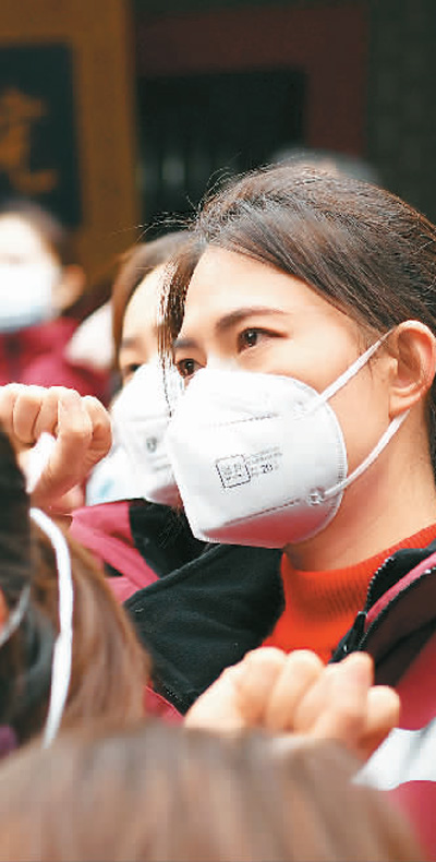 2月7日,四川省第五批援助湖北医疗队出征。图为队员出征前宣誓。 |