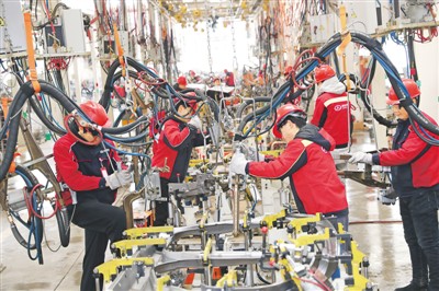 1月2日,工人在安徽省滁州市经济技术开发区安徽嘉安汽车有限公司焊接车间里焊接新能源汽车车体。 |