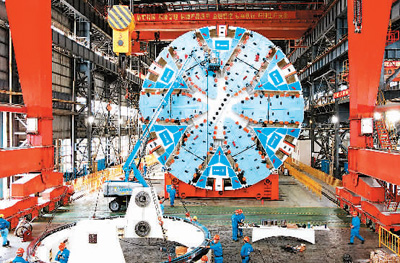 在隧道股份上海隧道工程有限公司机械制造分公司生产车间,工人对“骐跃”盾构机进行安装调试。 |