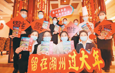 春节临近,浙江省湖州市爱山街道和利民社区为爱山商圈里百余名留湖过年的服务业人员,派送文旅消费券等新春暖心礼包、开展文旅惠民活动、发放优惠券和补助奖励等。当地推出一系列体现稳岗留工暖心举措,让外来留湖员工暖心过春节。