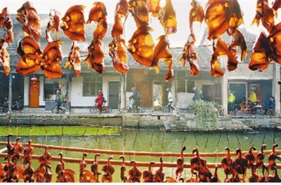 过桥绕水,走街串巷,站到桥上,我的眼睛努力捕捉着安昌每一处优美的景致。只见平时用来晾晒衣服的廊檐下、廊柱间,挂满了黑红油亮的腊肠、风干的鳊鱼、金色的酱鸭,在阳光的照耀下,泛着让人垂涎欲滴的酒红色,与河道上穿梭往来的乌篷船,构成了一幅色彩艳丽的中国传统年画。不得不说,安昌满街飘香、撩人味蕾的腊味,不仅是别样的舌尖诱惑,也是一道独特的风景。