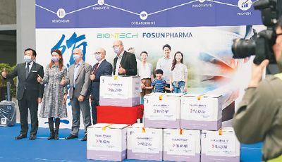 图为在物流配送中心,嘉宾庆祝疫苗抵港。 |