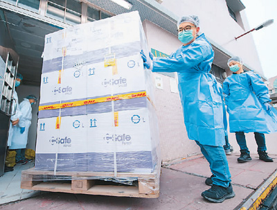 图为澳门的工作人员在搬运疫苗。 |
