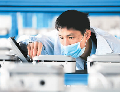 2021年1月12日,江西省赣州市一家充电技术公司的工人检测电动自行车充电桩。 |