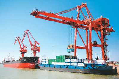 2021年2月20日,江苏省如皋港苏中国际集装箱码头港口机械正在吊装物资。 |