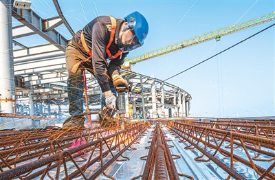 2021年2月20日, 海南省海口国际免税城项目工地的建设者们加紧施工。 |