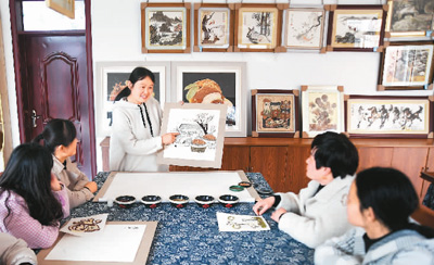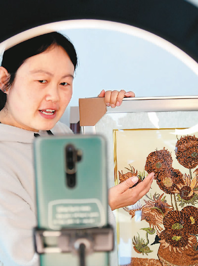 师献巧的工作室不仅有线下教学和体验,她还通过网络直播形式推介粮食画。 |