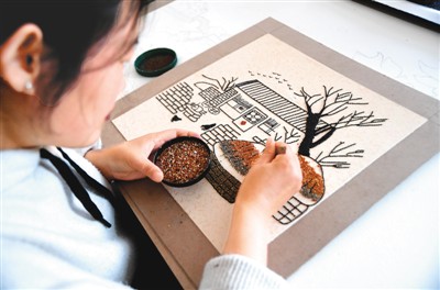 师献巧在工作室中制作粮食画。 |