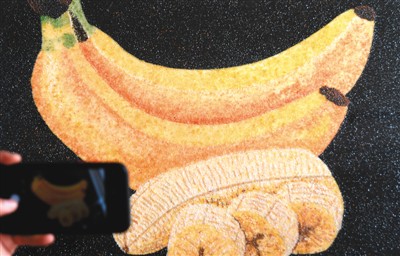 一名前来参观的游客在拍摄粮食画作品。 |