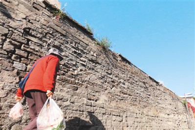 北京胡同里,原味儿的老砖墙很有沧桑感,现在越来越难见到。拍摄时,胡同里一位老人购物归来,正从墙边经过。 |