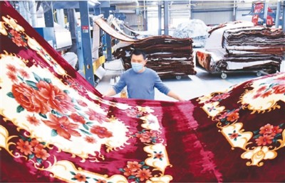 连日来,随着海外订单增加,江苏省连云港市毛毯加工行业迎来产销旺季,经纬编单双层印花毛毯、压花毛毯、精剪毛毯、绳绣毛毯等产品生产线均满负荷运转,以满足国际市场需求。图为4月19日,位于连云港市海州经济开发区的一家毛毯公司生产车间内,工人在检查生产线运行情况。