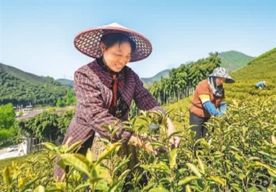 连日来,浙江省湖州市长兴县和平镇方家庄村茶场组织大量采茶工抢摘谷雨前茶,提高茶农经济收益。谷雨时节,气候温暖湿润,小芽迅速长成鲜叶,正是采茶制茶的大好时机。图为茶农采摘春茶。
