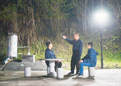 晚饭后,汤勇(左一)和同事们聚在保护管理站的院子里唱歌排解寂寞。 |