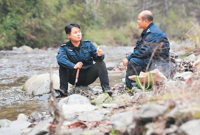 风餐露宿,对巡护山林的他们而言是家常便饭。上山途中,汤勇(左)和同事在溪流边休息。 |