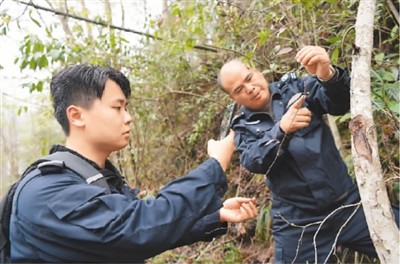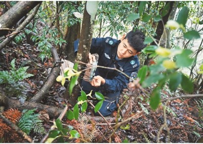 陈亮亮在密林中安装红外相机,以便搜集野生动物的影像资料。 |